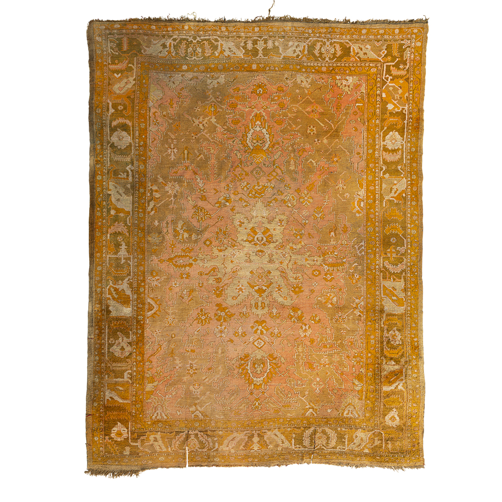 the salmon pink field with shaped olive medallion, similar spandrels, within olive palmette and vine border