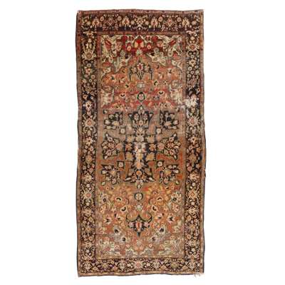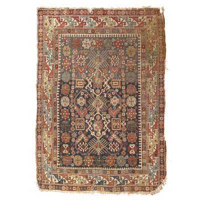 the indigo field with stylised wing pattern surrounded by rosettes, within ivory hooked geometric border; AND A SAROUK FEREGHAN RUG, the red field with indigo medallion, ivory spandrels, within indigo palmette and vine border (2)
