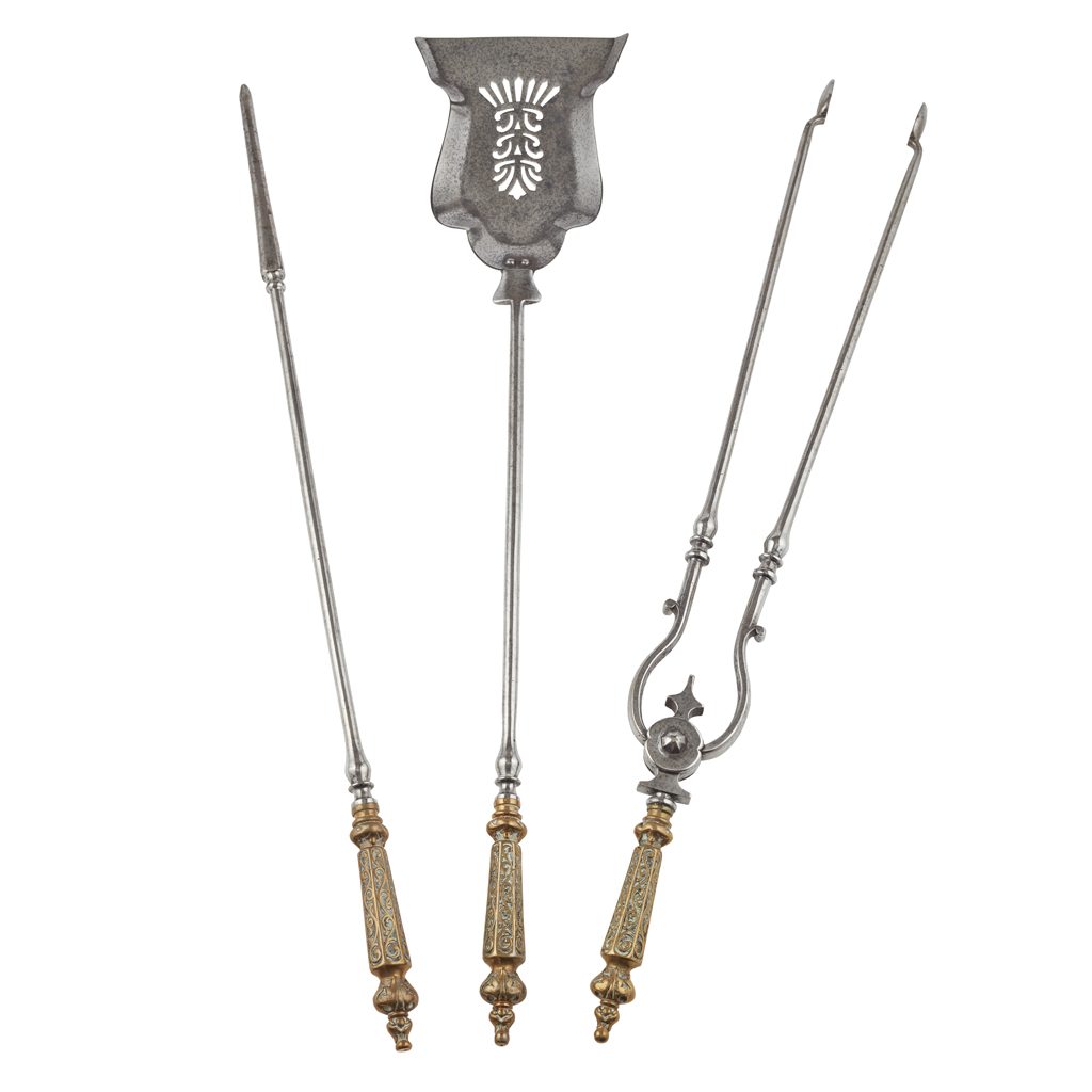 with knopped brass handles and scrolling foliage, comprising a pierced shovel, 79cm long; a poker, 79.5cm long; and a pair of tongs, 80cm long (3)
