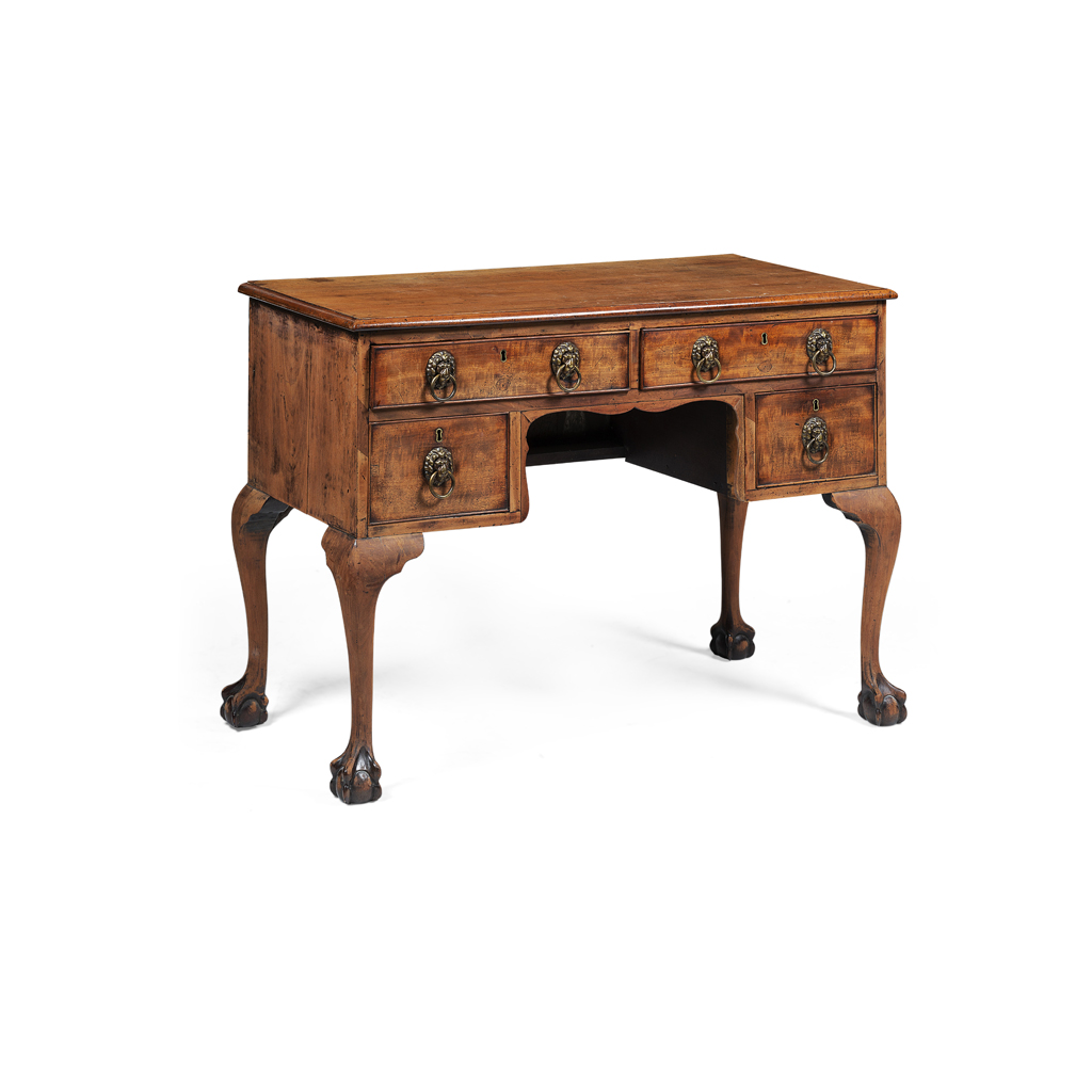 the rectangular top with a moulded edge above two short drawers and a shaped kneehole flanked by deep drawers, raised on cabriole legs ending in claw and ball feet