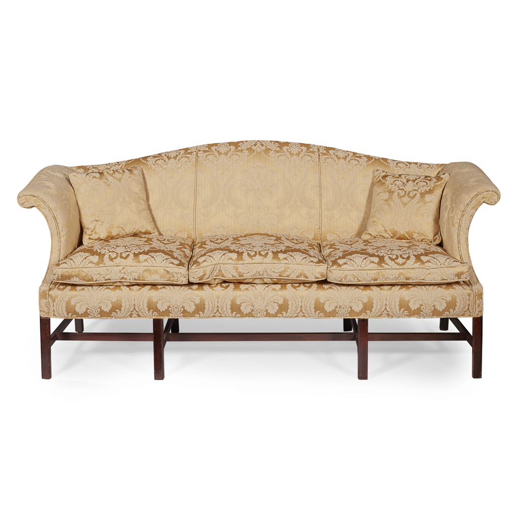 GEORGE III STYLE MAHOGANY FRAME CAMEL BACK SOFA