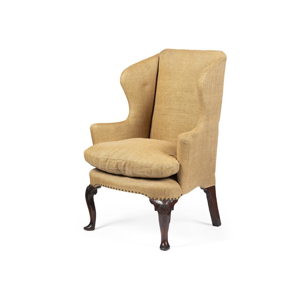 the straight back above a loose cushion seat with outscrolled arms, on shell-carved cabriole legs with pointed pad feet, covered in hessian with nail head trim
