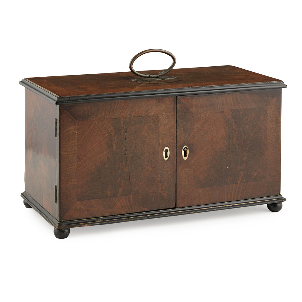of rectangular form with a loop handle, above twin doors opening to two pull-out caddies flanking a later moulded glass bowl, with an ivory knop handle to interior, all raised on squat ball feet, with a key