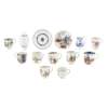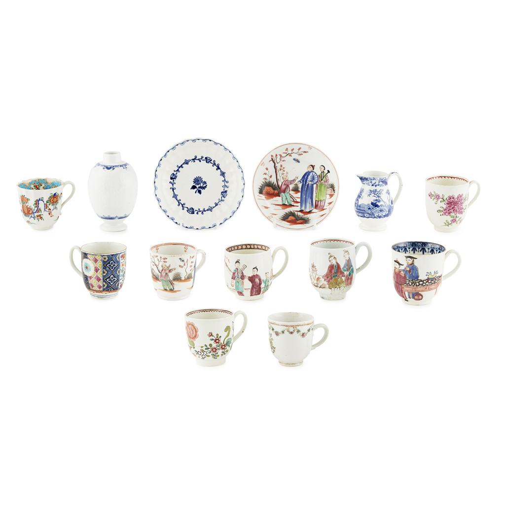 comprising a Liverpool 'Pilgrim Shell' pattern saucer, 15cm diam.; a Worcester 'Chrysanthemum' pattern tea caddy, marked, 12.5cm high; a sparrow-beak jug, 9cm high; a cup and saucer, decorated with Newhall's 'Boy and Butterfly' pattern, marked; a Worcester 'Jabberwocky' pattern cup, marked; a 'Conjurer' pattern cup; three cups painted with flowers, one or two possibly Liverpool; two cups painted in the Chinese style with figures; and a Worcester cup with diaper patterns and flowerheads in the Japanese taste, faux marks (13)