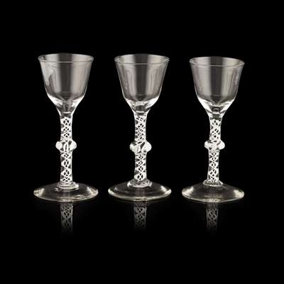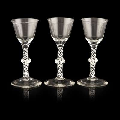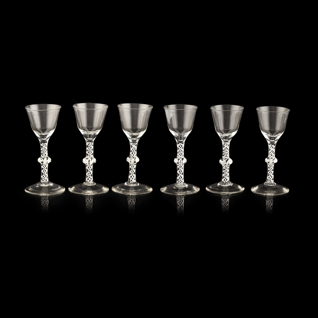 with ogee pointed bowls, raised on double series opaque twist stems with swollen cushion knops, all on conical feet (6)