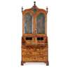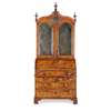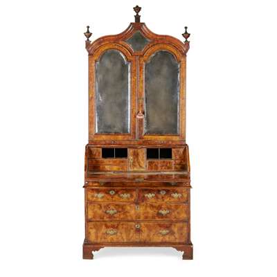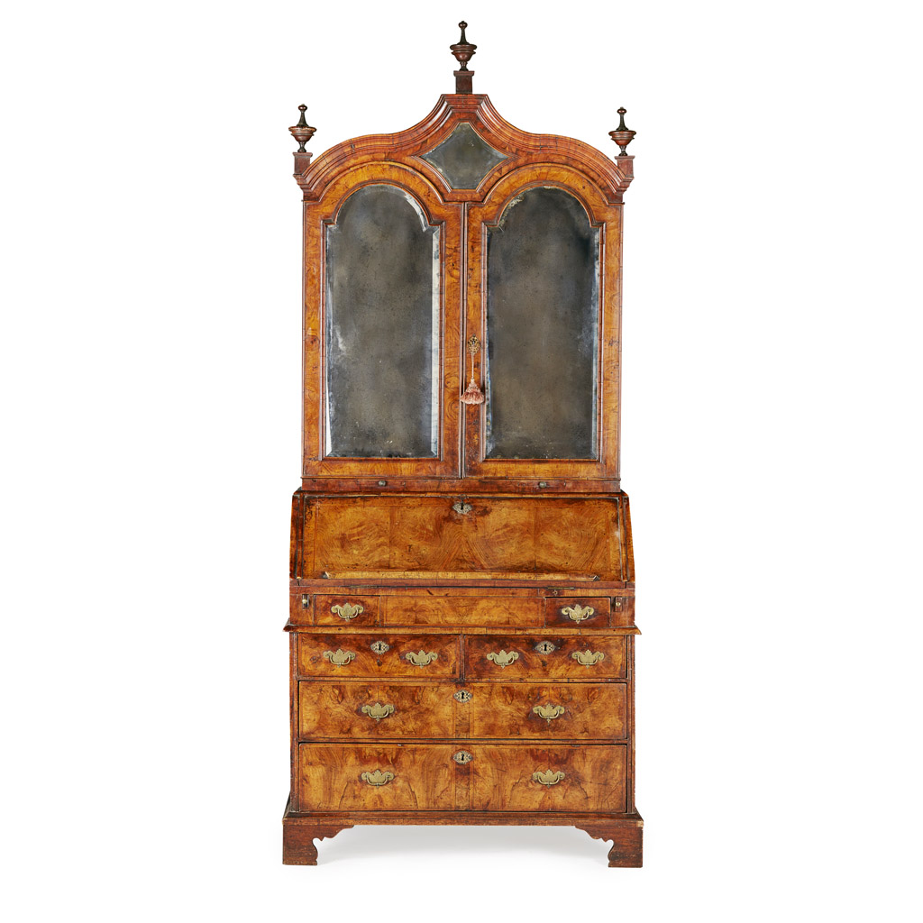 the moulded arched cornice mounted with turned finials and centred by a bevelled mirror panel, over a pair of moulded arched doors with bevelled mirror plates opening to an arrangement of shelves and pigeon holes, above a pair of candle slides; the lower part with a slant front opening to an interior fitted with small drawers and pigeon holes, over four long graduated drawers and raised on bracket feet