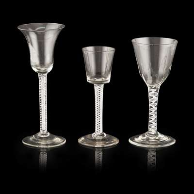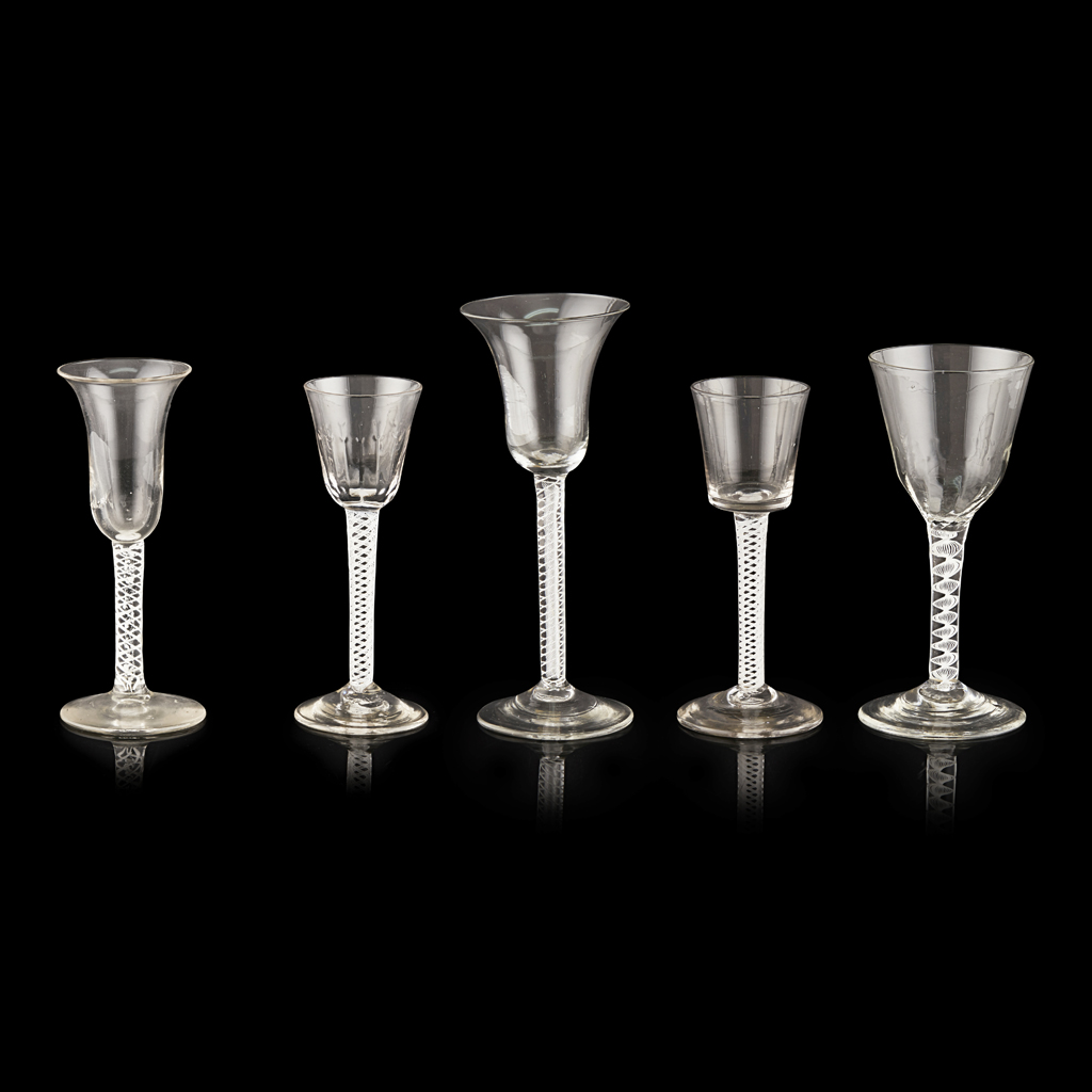 comprising a bell bowled glass with a mixed metal twist stem, 18.5cm high; an ogee bowled glass, a bucket bowled glass and a round funnel bowled glass with moulding, all on single series opaque twist stems, 16cm and 15cm high; together with a DUTCH MIXED METAL TWIST STEM WINE GLASS, 19th century, with a bell-shaped bowl, 16cm high (5)