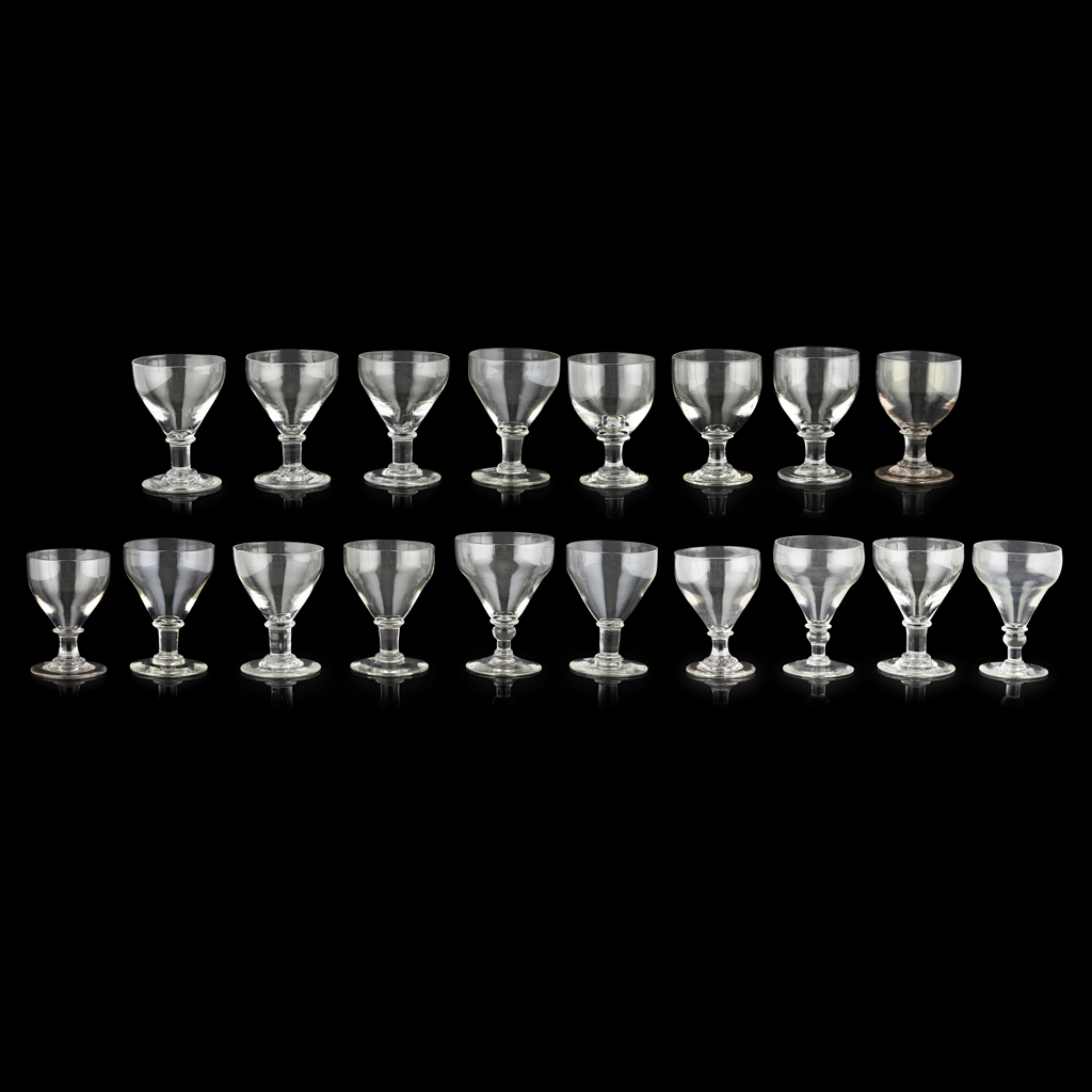 of slightly varying size and shape, the majority with large ogee bowls including one engraved J. BERRY, three with knopped stems, the remaining with cylindrical plain stems and flat feet (18)