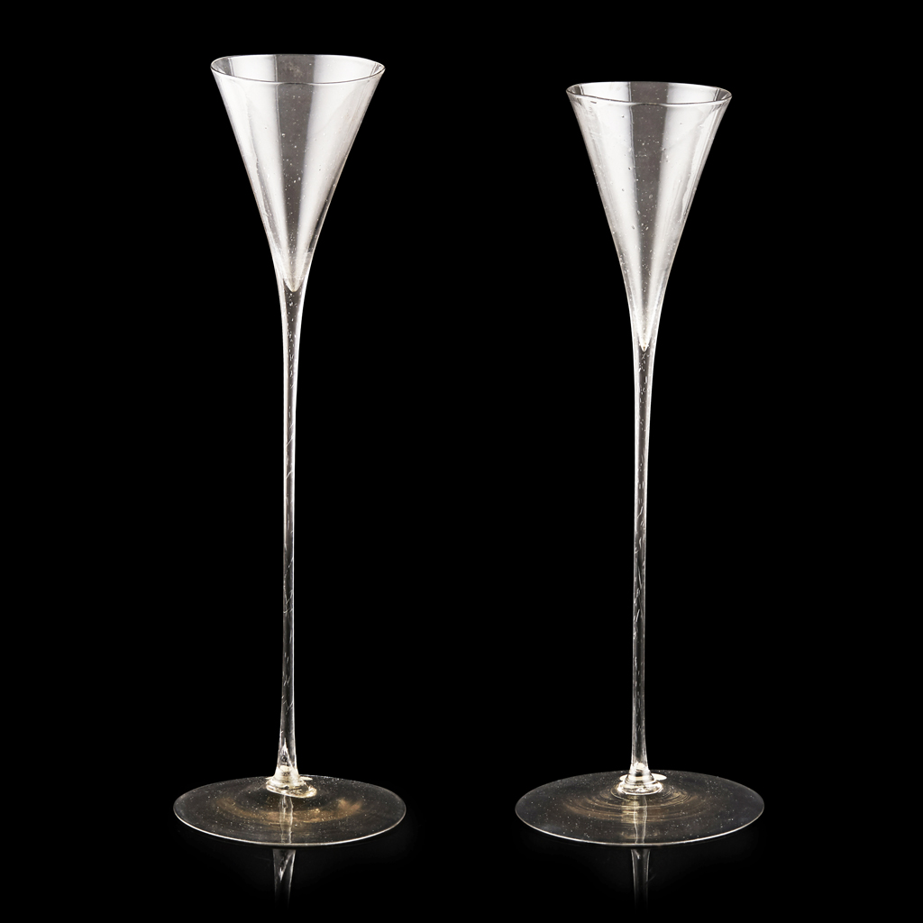 with flared trumpet-form bowls, raised on fragile slender stems and flat circular feet (2)