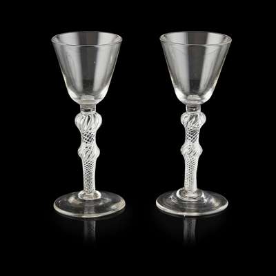 with rounded funnel bowls raised on doubled knopped air twist stems and conical feet (2)