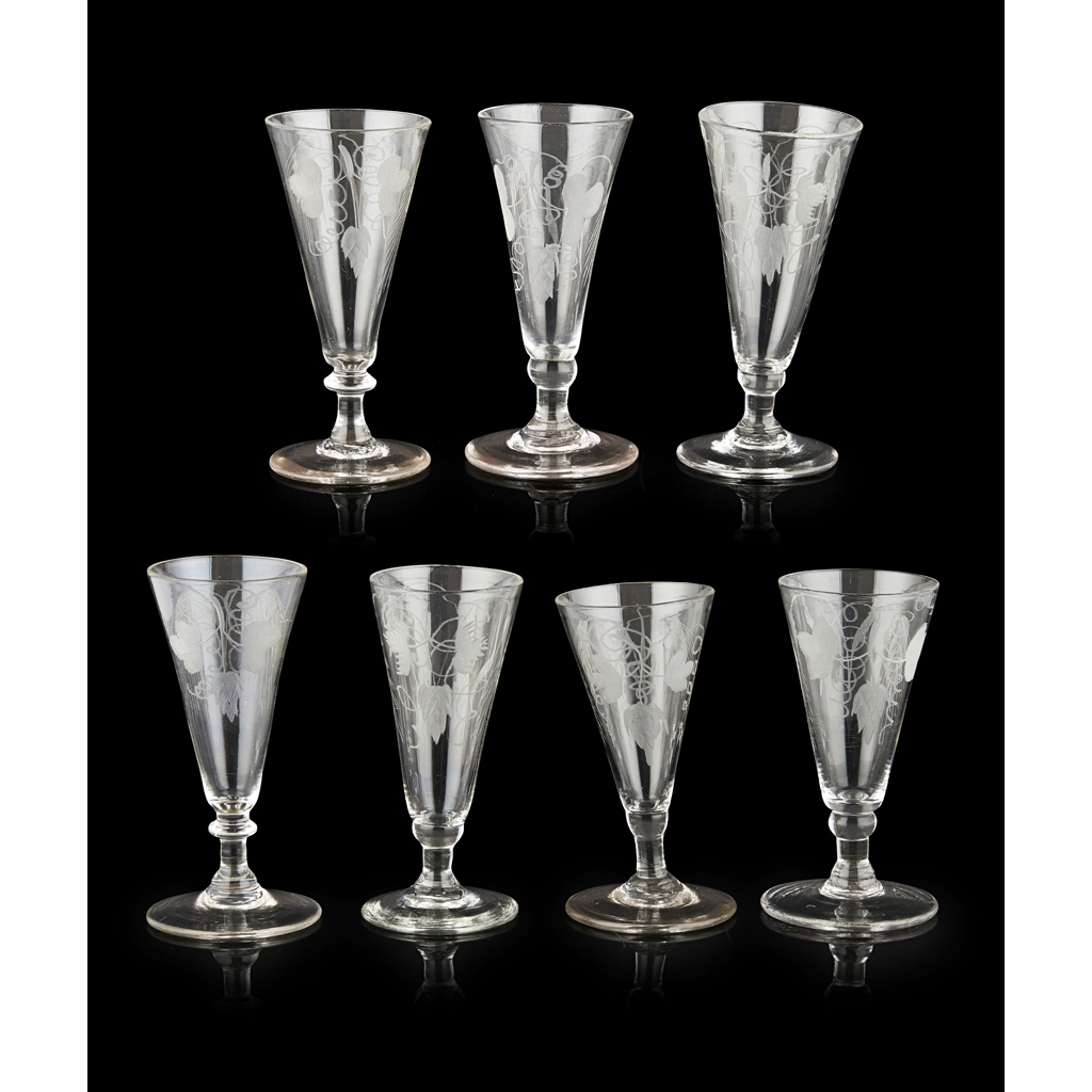 SEVEN GEORGIAN ETCHED ALE GLASSES
