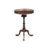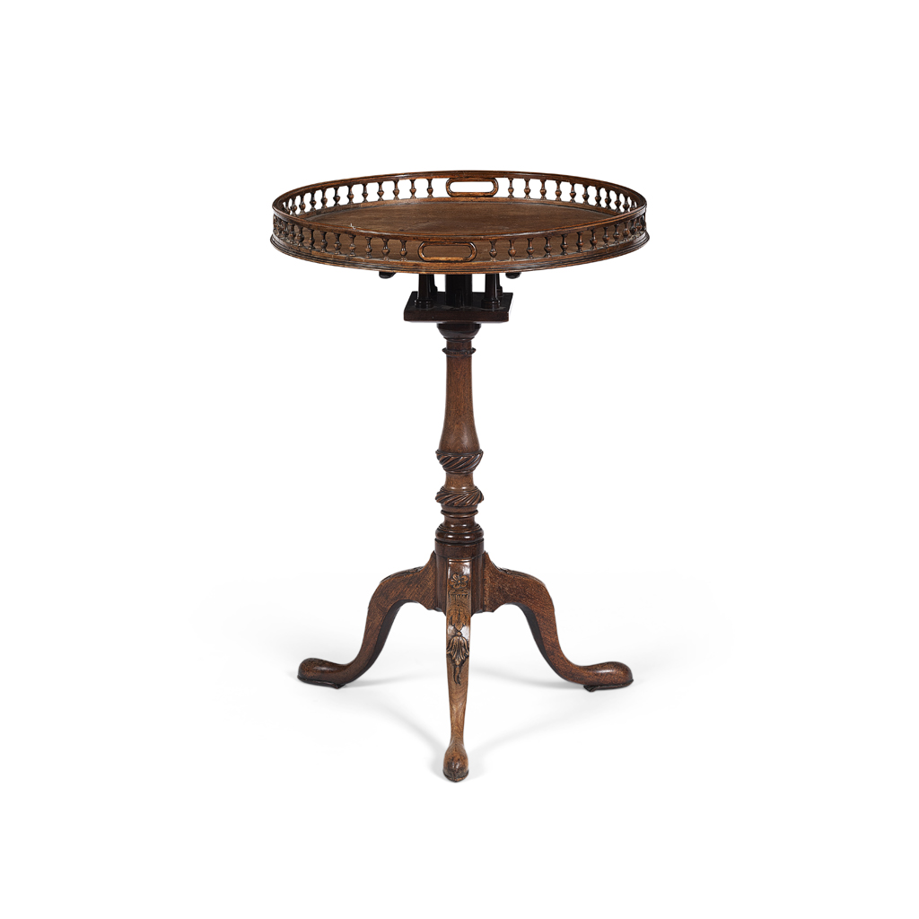 the circular tilt top with a gallery rail, on a birdcage and spiral carved baluster support, the tripod base carved with flower heads and acanthus, ending in pointed pad feet