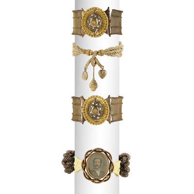 the first made up of various interlocking strands enclosing a daguerreotype photograph of a gentleman within a gilt metal frame; the second, a blonde example with engraved gilt clasp and pendants enclosing woven hair; together with a PAIR OF GILT METAL MESH CUFF BRACELETS, with filigree roundels (4)