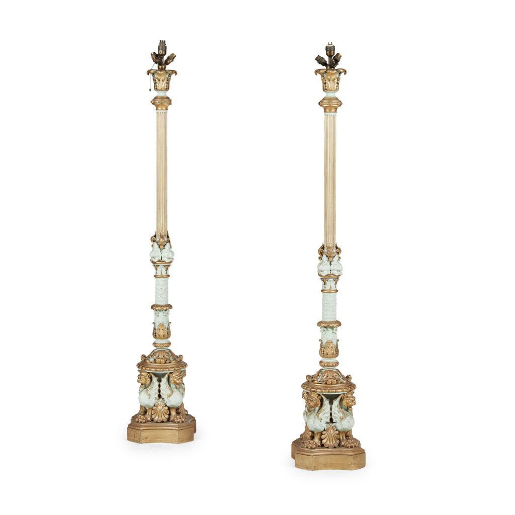 PAIR OF REGENCY PARCEL GILT AND PAINTED STANDARD LAMPS
