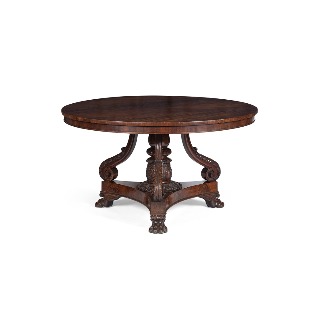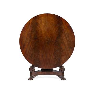 the figured circular tilt top above a plain frieze, over an acanthus carved column and scrolled supports ending on a triform base raised on carved lion paw feet