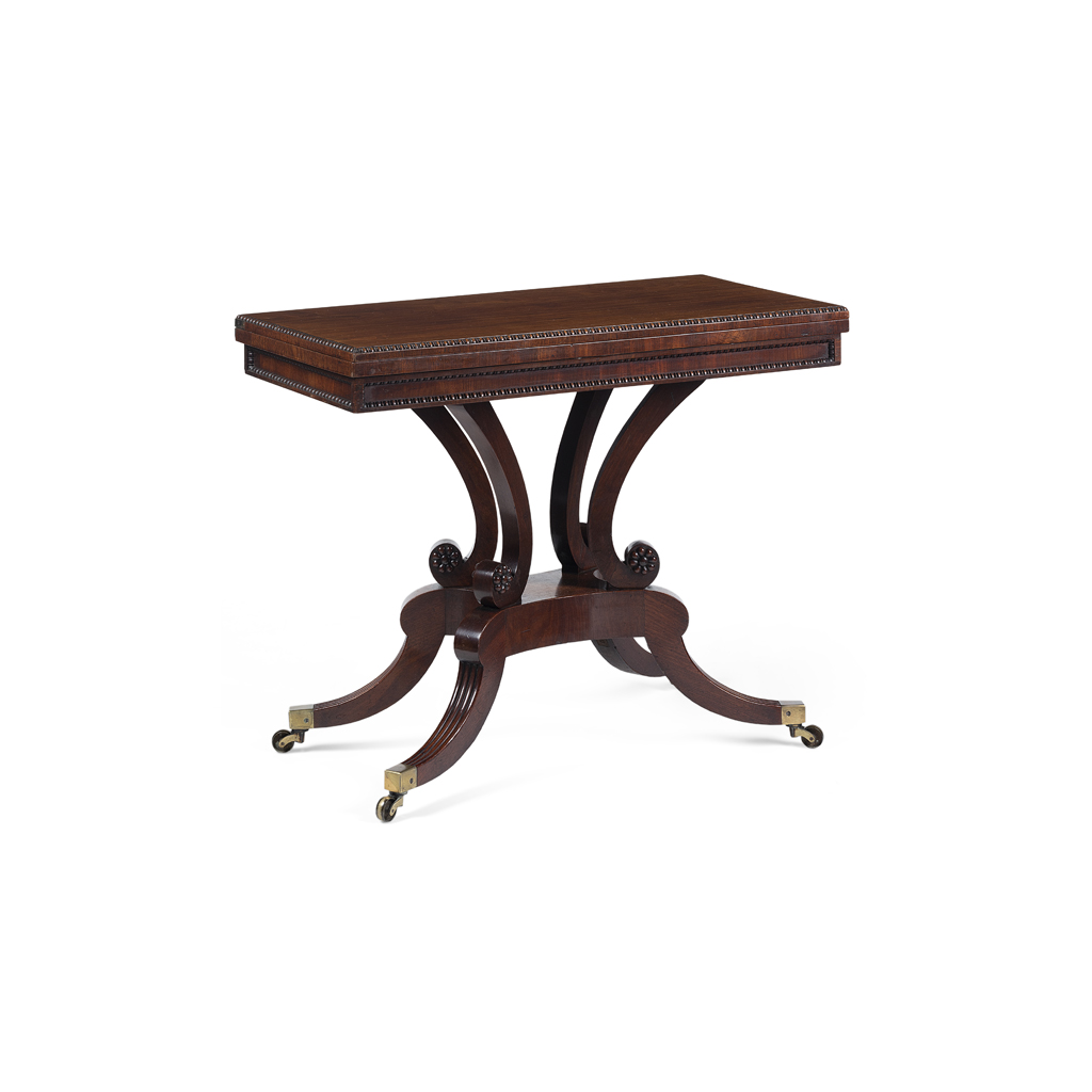 the rectangular fold-over top with a bead moulded edge, raised on scroll supports carved with rosettes, on a quadriform base with hipped sabre reeded legs with brass caps and castors
