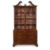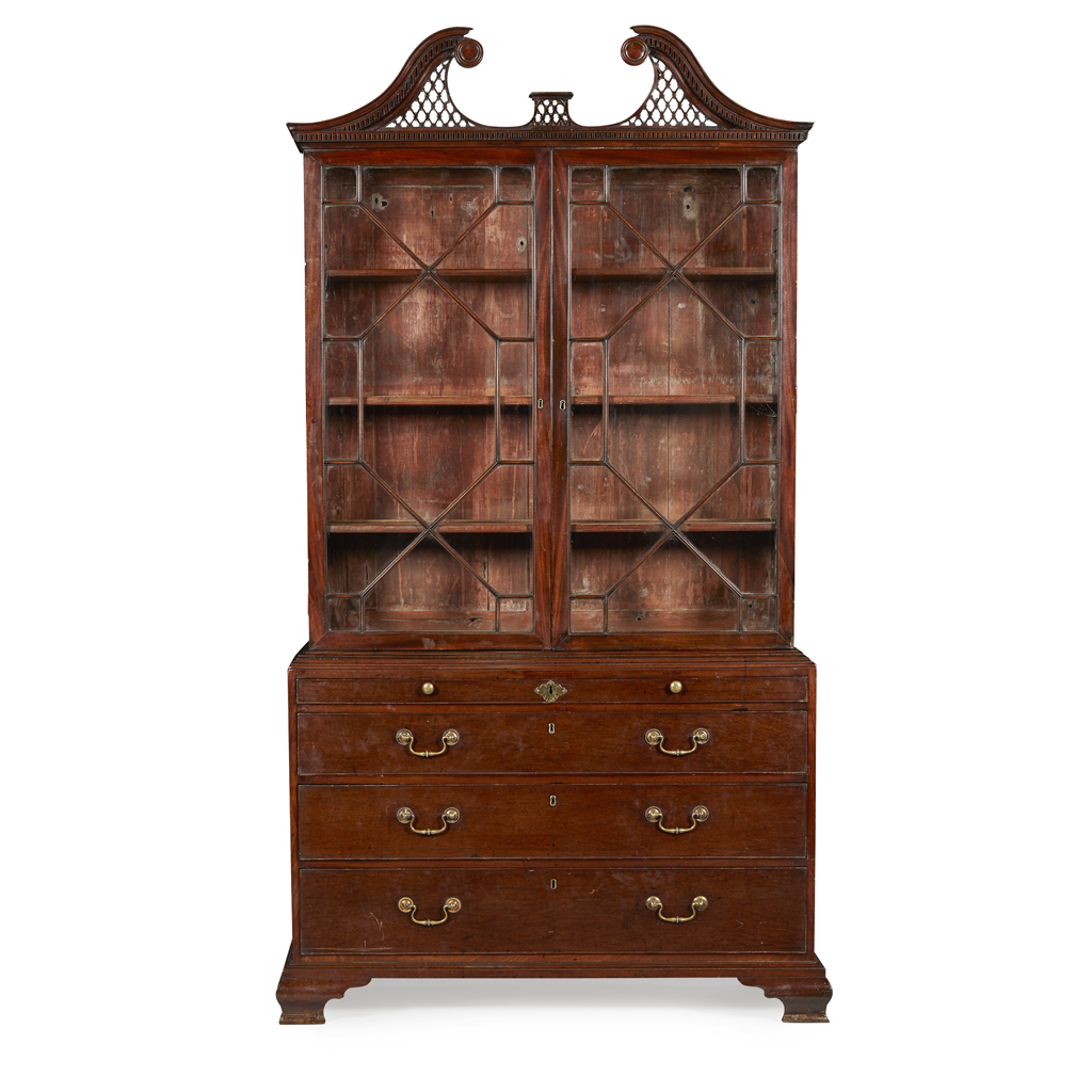 the pierced broken swan neck pediment above astragal glazed doors opening to adjustable shelves; the projecting base with a shallow drawer fitted with pen and ink compartments, over three graduated long drawers, raised on ogee bracket feet