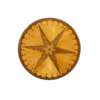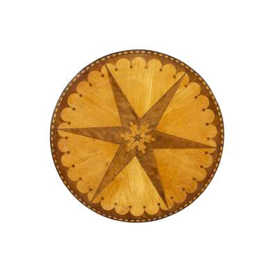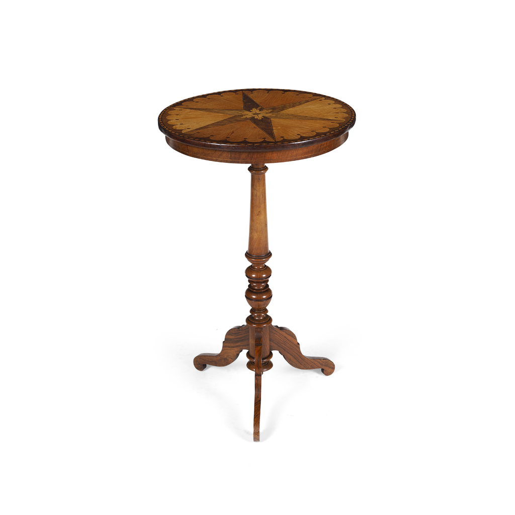 the circular top inlaid with a star motif within a scallop and dot border, on a turned baluster support raised on flattened scrolled legs