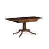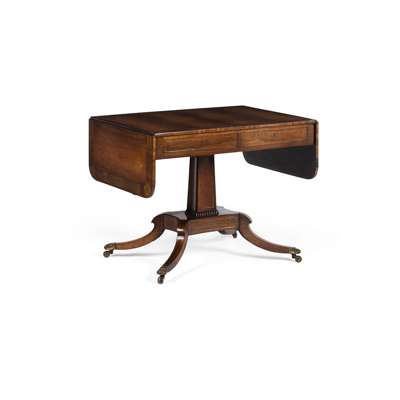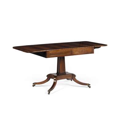 the rounded rectangular top with drop leaf ends with crossbanding and brass line and bellflower inlay, above a pair of short frieze drawers with dummy drawers opposing, raised on a concave tapered square column and quadriform base with hipped sabre legs ending in hairy paw brass caps and castors