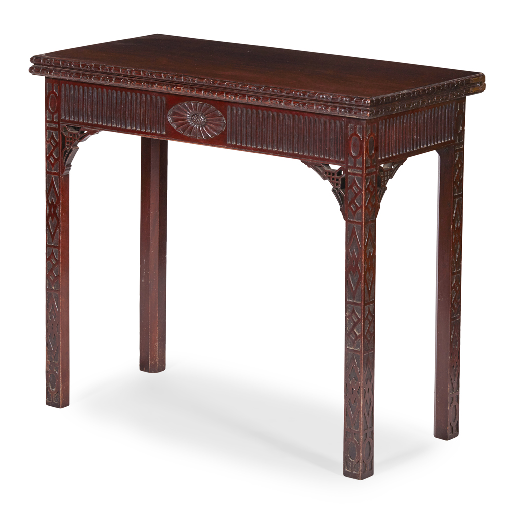 LATE GEORGE II MAHOGANY 'CHINESE CHIPPENDALE' FOLD-OVER CARD TABLE