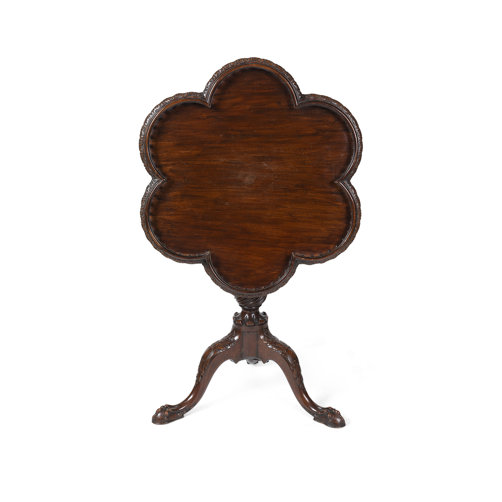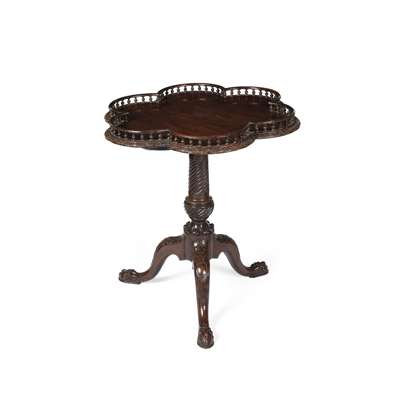 the lobed tilt top with a gallery rail, on a spiral carved baluster column and acanthus carved legs ending in claw feet