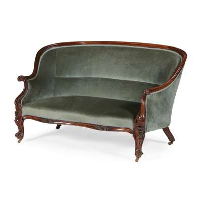 the curved back and scrolled arms upholstered in green plush, raised on floral scroll carved cabriole legs with brass castors