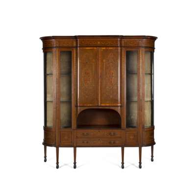 the moulded bowfront cornice above a pair of doors above an arched recess with two drawers below, flanked by glazed panels and bowfront doors enclosing glass shelves, raised on square tapered legs ending in spade feet; the whole inlaid with urns, garlands, swags and trails