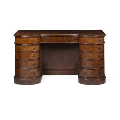 of inverted serpentine outline, the moulded top above a long frieze drawer and open kneehole, flanked by banks of five short drawers, on plinth bases