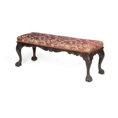 the long padded seat covered in floral brocade above a shaped and carved seat rail, raised on shell carved cabriole legs ending in hairy paw feet