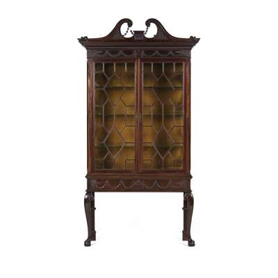 the swan neck pediment carved with laurel swags above a swag carved frieze and pair of astragal glazed doors opening to glass shelves, with further swag carving to the base, raised on cabriole legs ending in ball and claw feet