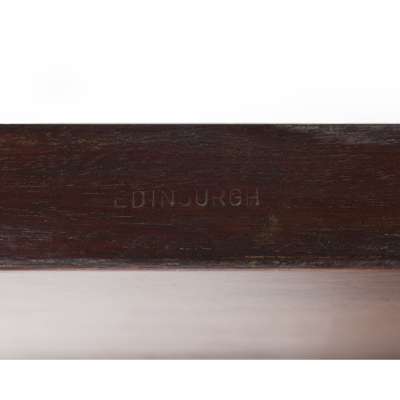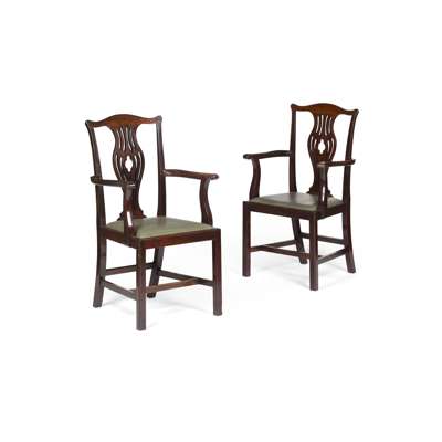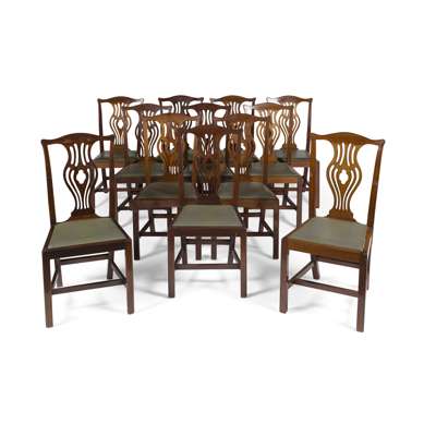 comprising twelve side chairs and a pair of armchairs, with shaped toprails above pierced splats and drop-in pad seats covered in green leather, raised on square legs joined by stretchers, eight examples stamped EDINBURGH to the seat rails (14)