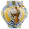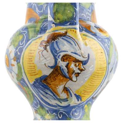 of typical form with short spout and strap handle, with opposing portrait roundels of a Turkish man and a soldier, within scrolling foliage and flowers in orange, yellow, green and white glazes on a blue ground