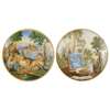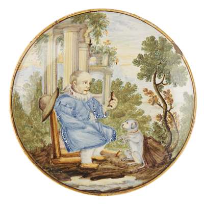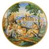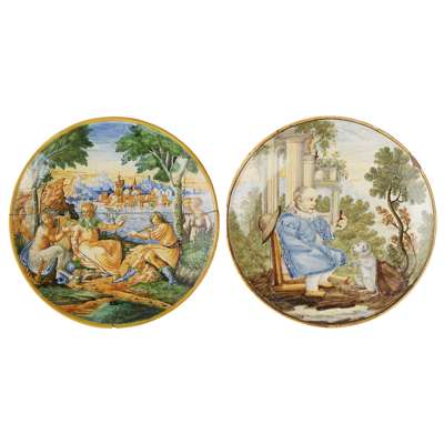 comprising a larger example painted depicting the Judgement of Midas, in a riverscape, initialled TM, 24.5cm diam.; and a smaller example, possibly Abruzzo, depicting a seated man presenting a treat to a dog, in a ruin landscape, 15cm diam. (2)