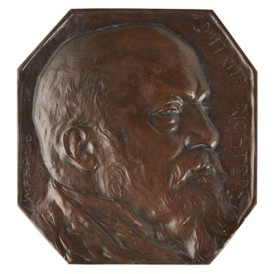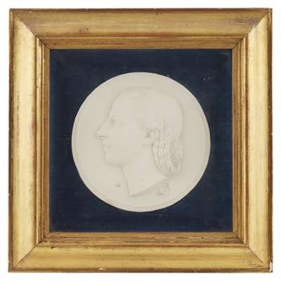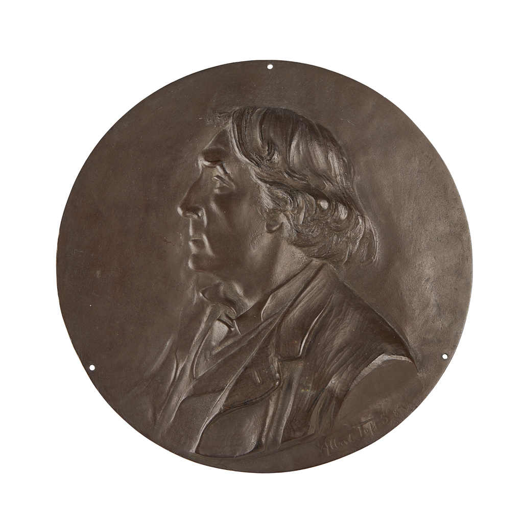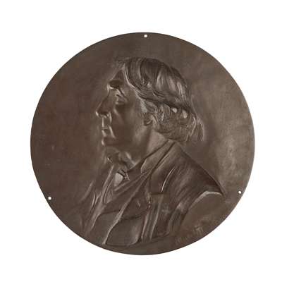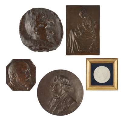 signed and dated '87, 25cm diameter; together with a BRONZE PORTRAIT PLAQUE BY WILHELM FRASS (1886-1968), depicting Dr. Hans Richter, dated 1914, inscribed DR HANS RICHTER, signed and dated W. FRASS/ 1914, and with monogram, 14.5cm high; a PLASTER ROUNDEL OF JOHN KEATS, with artist's monogram and dated IXIII, in a glazed giltwood frame, 15.5cm diam. approx.; a BRONZE PORTRAIT ROUNDEL ATTRIBUTED TO THOMAS STIRLING LEE (1857-1916), depicting the profile of a woman, possible Mrs Rodney Fennessy, 17.5cm across; and a BRONZE PLAQUE BY ALEXANDRE CHARPENTIER (1856-1909),'Maternite', with artist's monogram, 23cm x 15.5cm (5)