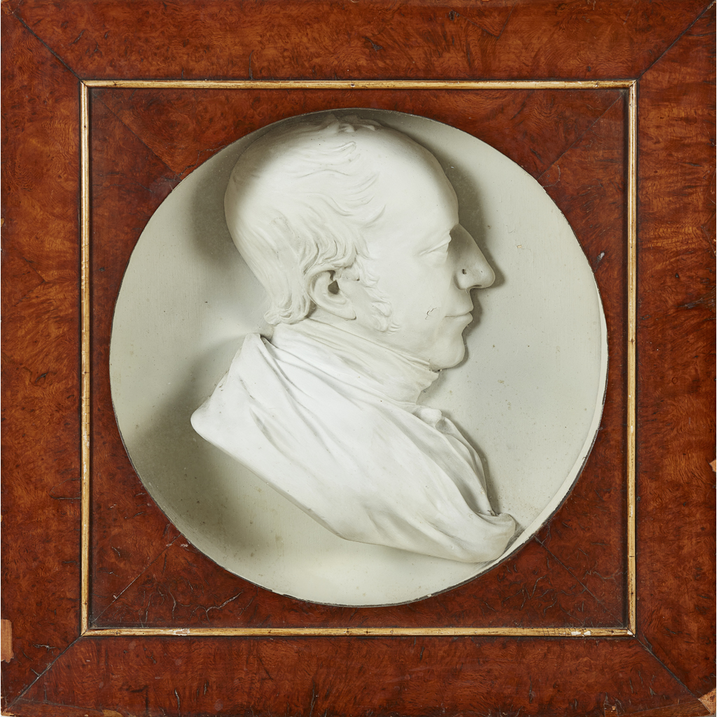 the circular portrait in high relief, in a glazed walnut case with gilt border, unsigned