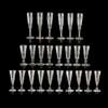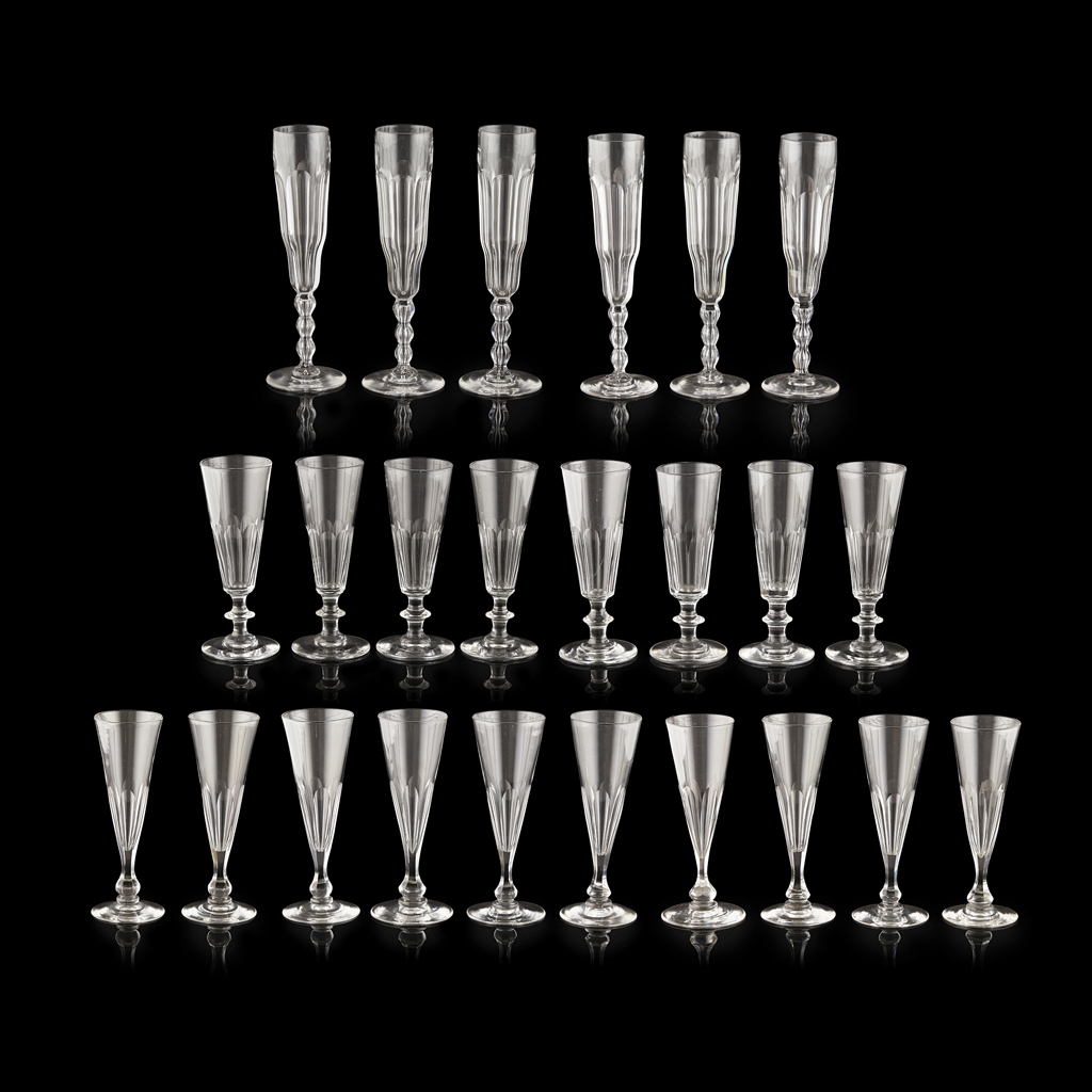 all with thumb-cut bands to the lower bowls, comprising a set of six tall flutes with triple-knop stems, 22cm high; a set of eight flutes with annular knops, 16.5cm high; and a set of ten flutes with knops to the stem bases, 17cm high (24)