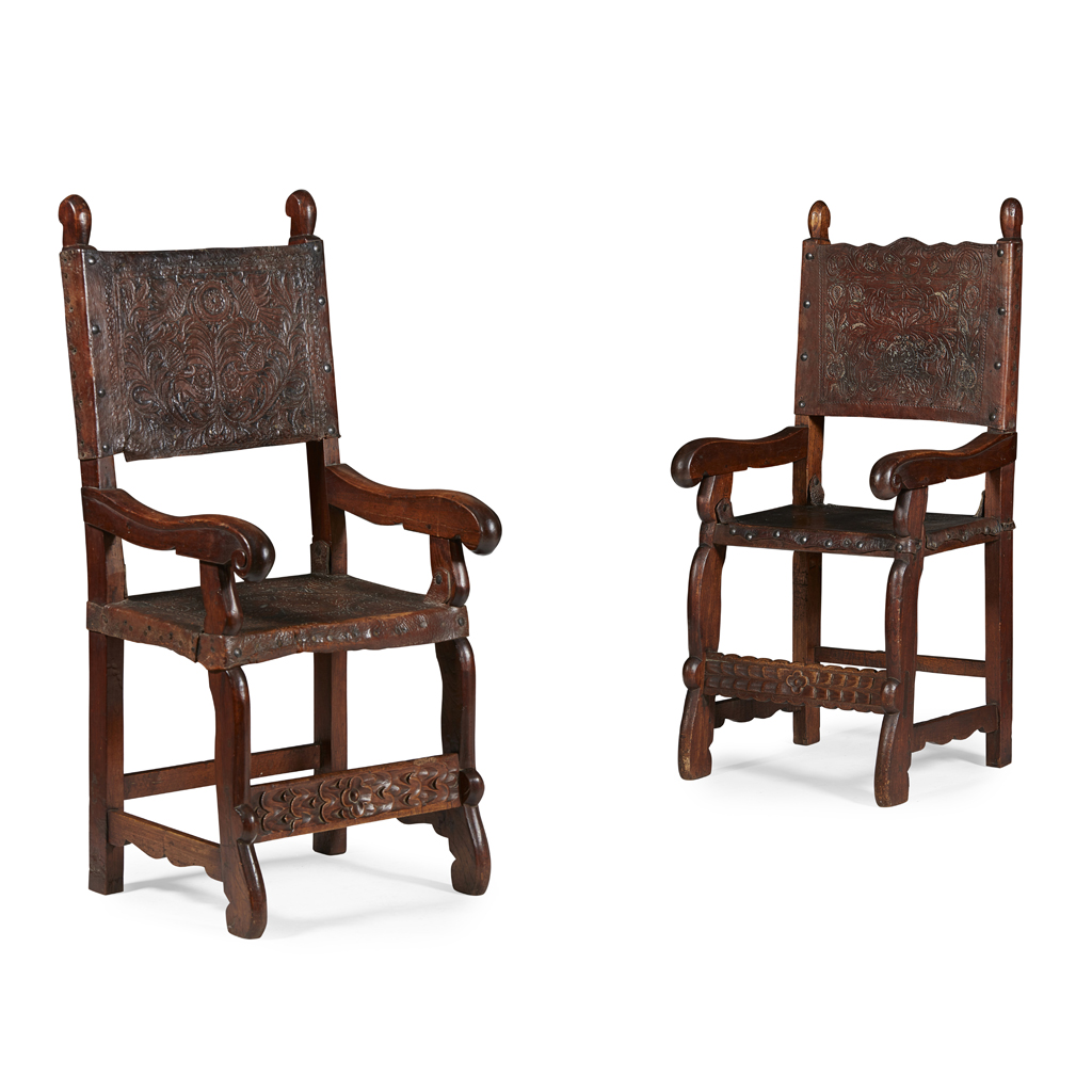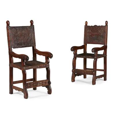 PAIR OF SPANISH OAK AND LEATHER ARMCHAIRS