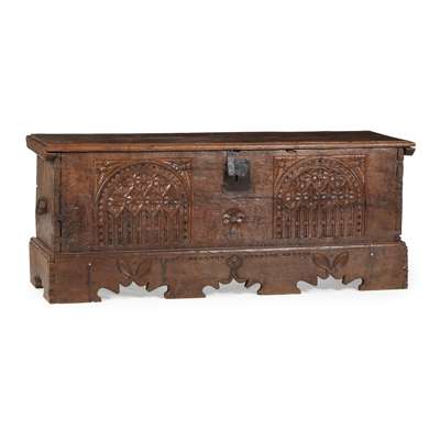 the hinged rectangular top over a front with twin gothic arch and floral carved panels, with iron ring handles to the sides, raised on a shaped plinth base