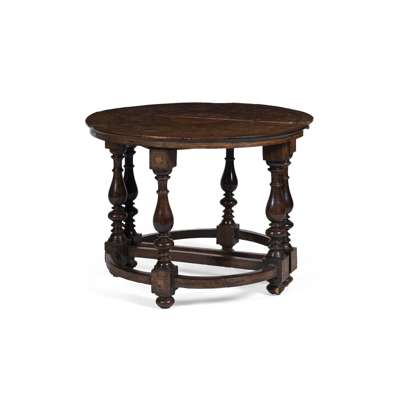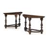 the tops inlaid with leaf scrolls bands, each raised on baluster supports with flowerhead inlay, joined by stretchers and ending in bun feet; when joined the tables form a centre table with concentric bands enclosing a central roundel