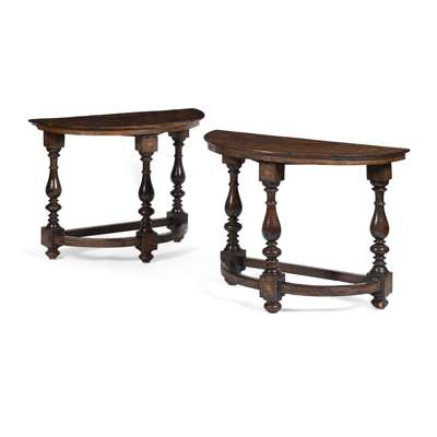 PAIR OF ITALIAN WALNUT AND FRUITWOOD MARQUETRY DEMILUNE SIDE TABLES
