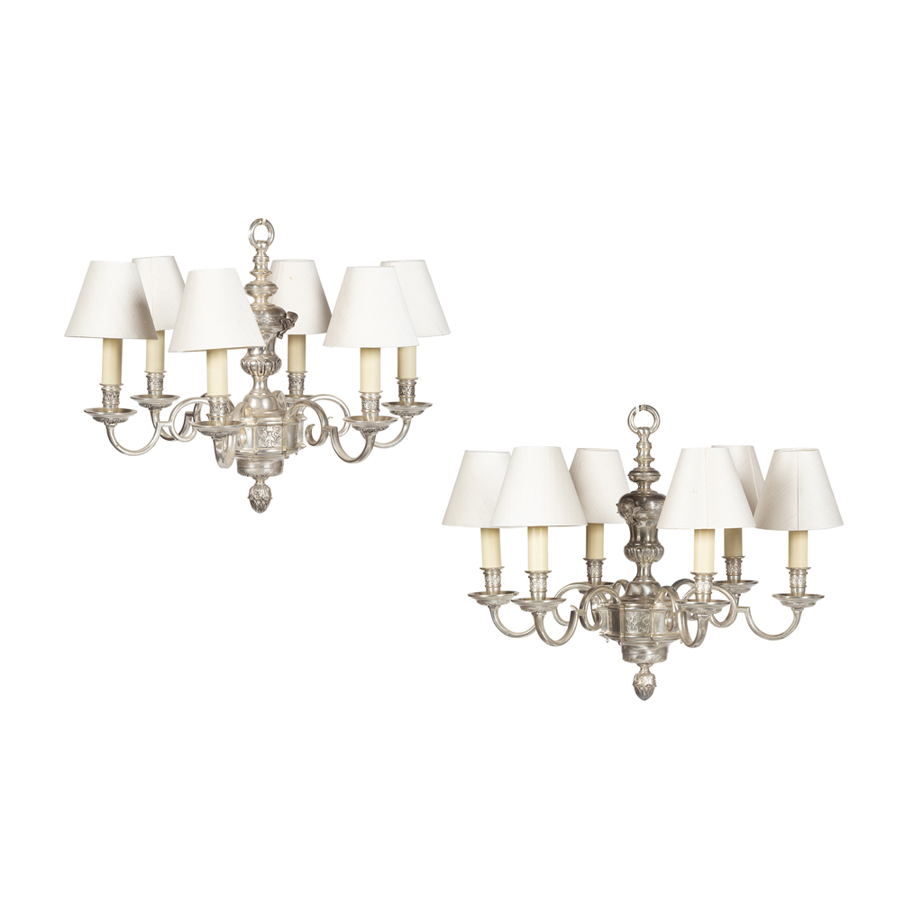 PAIR OF SILVERED METAL SIX BRANCH CHANDELIERS