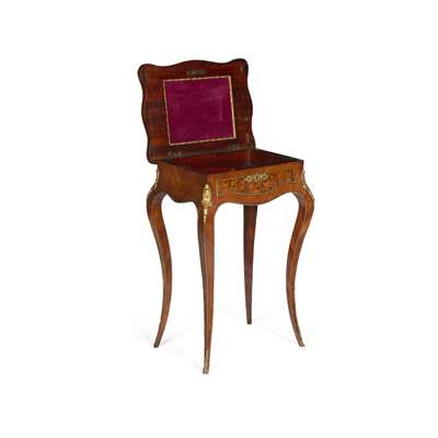 FRENCH KINGWOOD, PARQUETRY, AND GILT METAL MOUNTED WORK TABLE