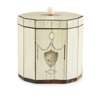 of decahedron form with a ball finial, above a white metal shield-shaped plaque and mother-of-pearl inlay, opening to a void interior