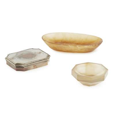 comprising a white metal mounted box and cover, with chamfered concave corners, 9cm wide; an oval orange agate dish, 15cm wide; and a small octagonal bowl, 7cm wide (3)