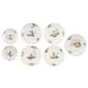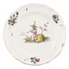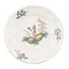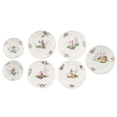 of various sizes and including two small plates, one with blue maker's mark, with lobed rims with fruit and flower sprays, enclosing polychrome figures of Chinese figures engaged in various pursuits, including fishing, holding fans, dancing and smoking pipes (7)