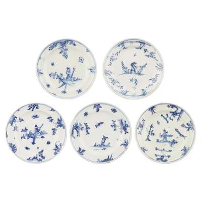 FIVE FRENCH BLUE AND WHITE FAIENCE PLATES