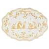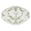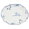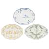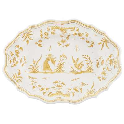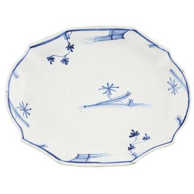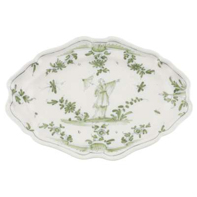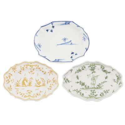 of shaped oval form with lobed rims, comprising an orange enamel example depicting a man and a bird within floral borders, underglaze cross mark, possibly Moustiers, 33cm wide; one in green enamel depicting a Chinese man with a parasol, 36cm wide; and a blue enamel example simply painted with flowers and fronds, 36.5cm wide (3)