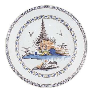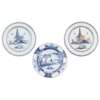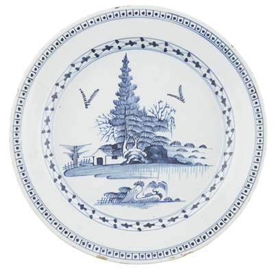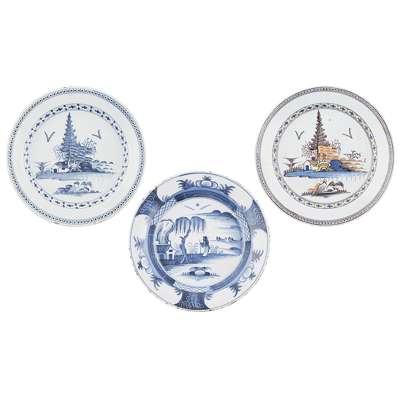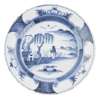 comprising a polychrome example decorated with a riverscape with trees and a building; a blue and white charger, depicting the same scene; and a further blue and white example, decorated with a figure in a landscape (3)