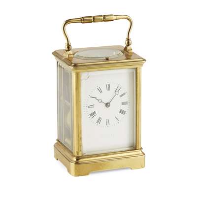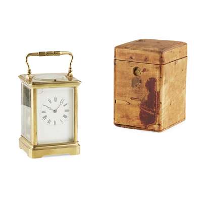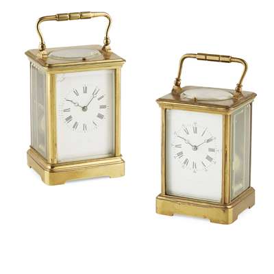 each corniche case enclosing a white enamel Roman numeral dial, with gong strike movement; one signed with retailer W. ANGUS & SON/ PARIS, the other with rubbed signature; together with an associated leather travel case