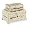 with upper and lower hinged compartments, veneered with carved panels of stylised foliate bands, and with red and green stained incised decoration, on bracket feet